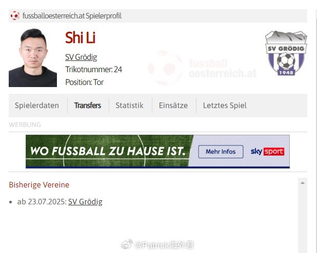 10月5日讯 据媒体东谈主“Patrick国际君”深远,前成齐蓉城门将李实加盟奥地利第4级别联赛俱乐部SV格勒迪希。