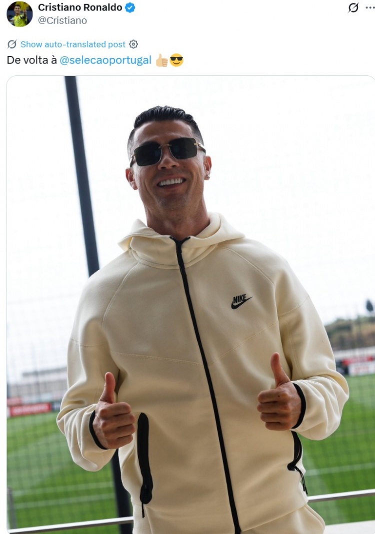 C罗社媒晒回到葡萄牙国度队报说念像片,戴墨镜出镜帅气填塞