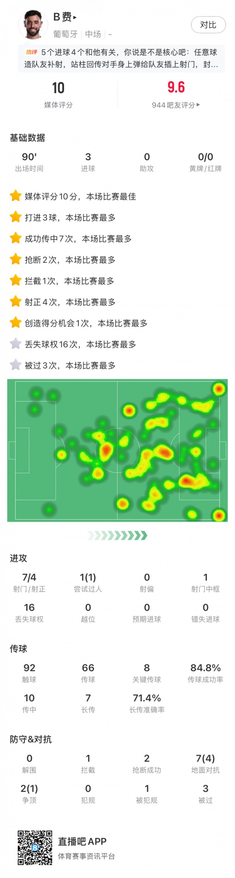 满分评分!B费数据:7射门4射正,传球告捷率85%,8次关节传球