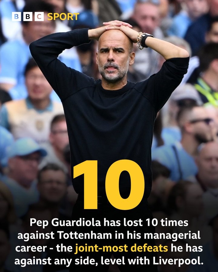 BBC统计标明,瓜迪奥拉主帅生活照旧10次输给热刺,热刺目下和利物浦比肩,成为打败瓜迪奥拉次数最多的球队。