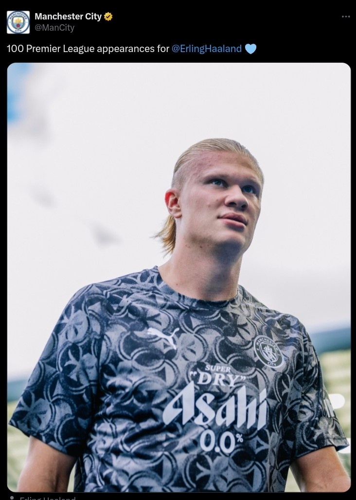 曼城官推晒照记挂哈兰德百场英超里程碑,此前孝敬87球17助