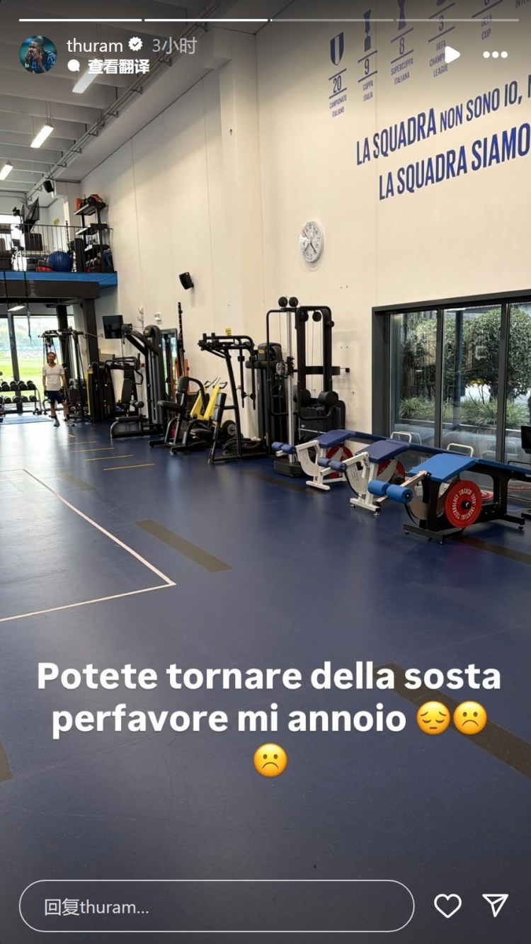 10月13日讯 国米时尚图拉姆社媒喊话队友,但愿他们快点从国度队回到俱乐部。