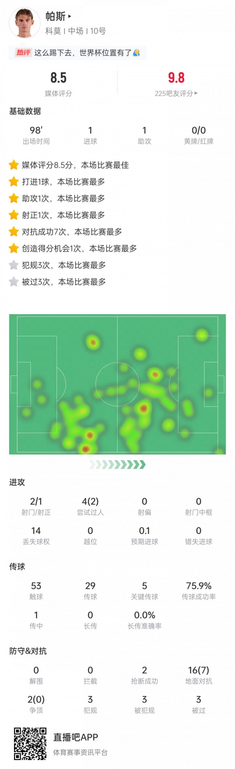 帕斯本场数据:传射立功+5次关节传球,获评8.5分全场最高