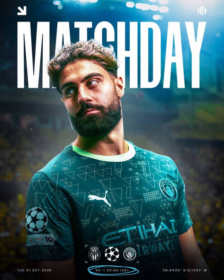 曼城发布欧冠客战比利亚雷亚尔海报:格瓦迪奥尔单东谈主出镜