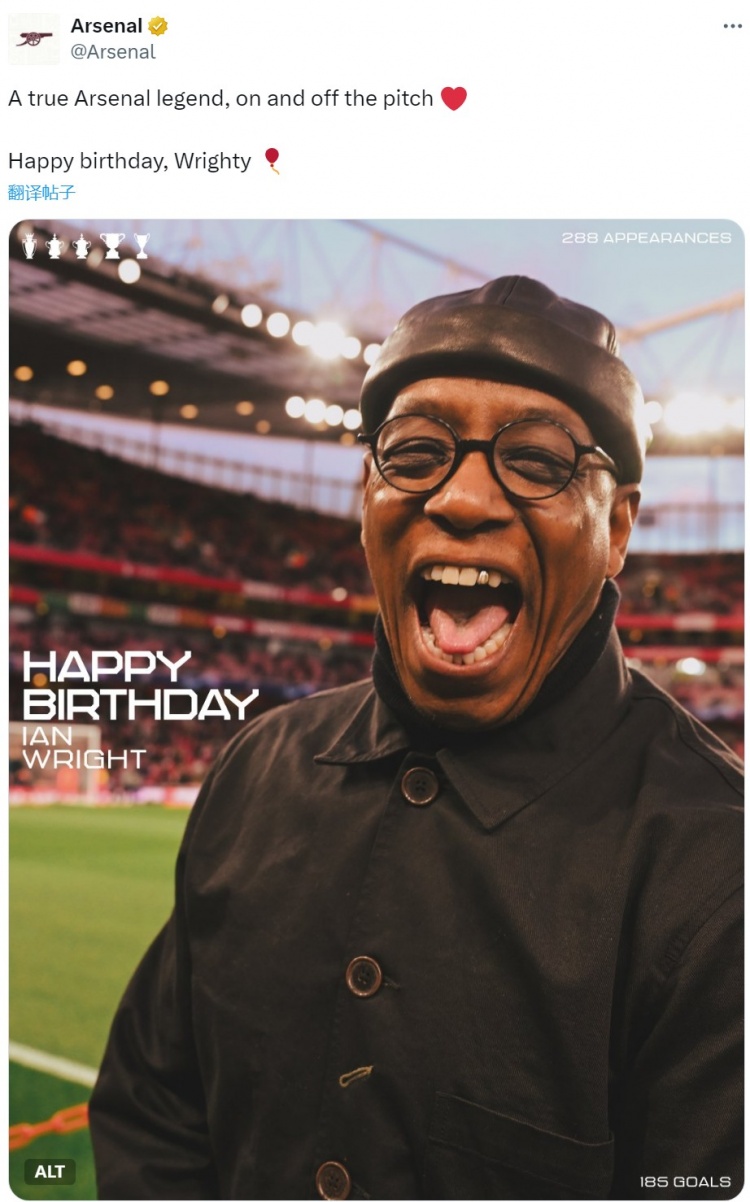 阿森纳官方社媒晒出伊恩-赖特的像片,配文:“一位果然的阿森纳传说,无论场上仍是场下。诞辰欢娱,赖特。”