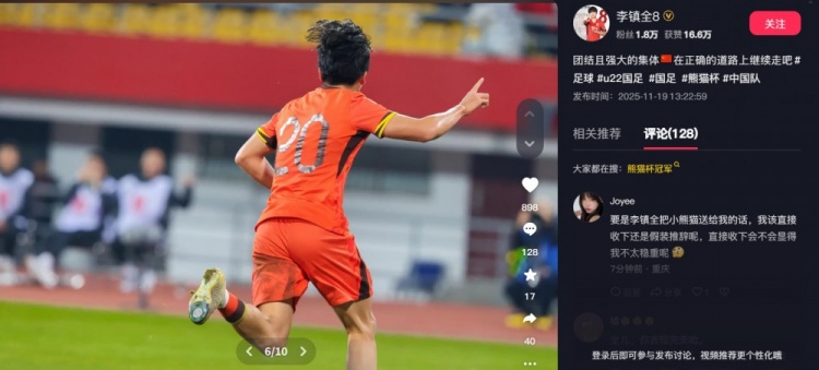 2025年熊猫杯落下帷幕,U22国足1胜1平1负取得亚军,李镇全阐扬不俗,他在对阵韩国时打入一球但被吹无效。