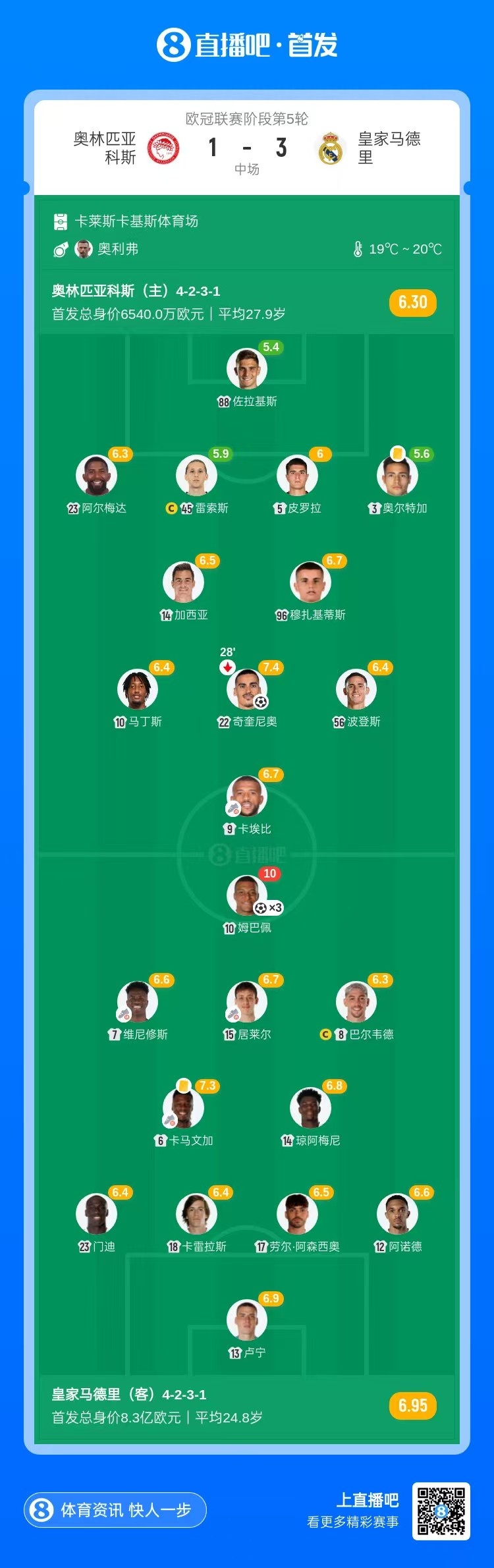 11月27日讯 北京工夫4:00,欧冠联赛阶段第5轮,奥林匹亚科斯vs皇家马德里,比赛在卡莱斯卡基斯畅通场打响!上半场,奇奎尼奥匡助奥林匹亚科斯最初破门!随后姆巴佩7分钟内演出帽子戏法!维尼修斯进球被吹;琼阿梅尼远命中横梁!半场戒指,皇马暂3-1高出奥林匹亚科斯。