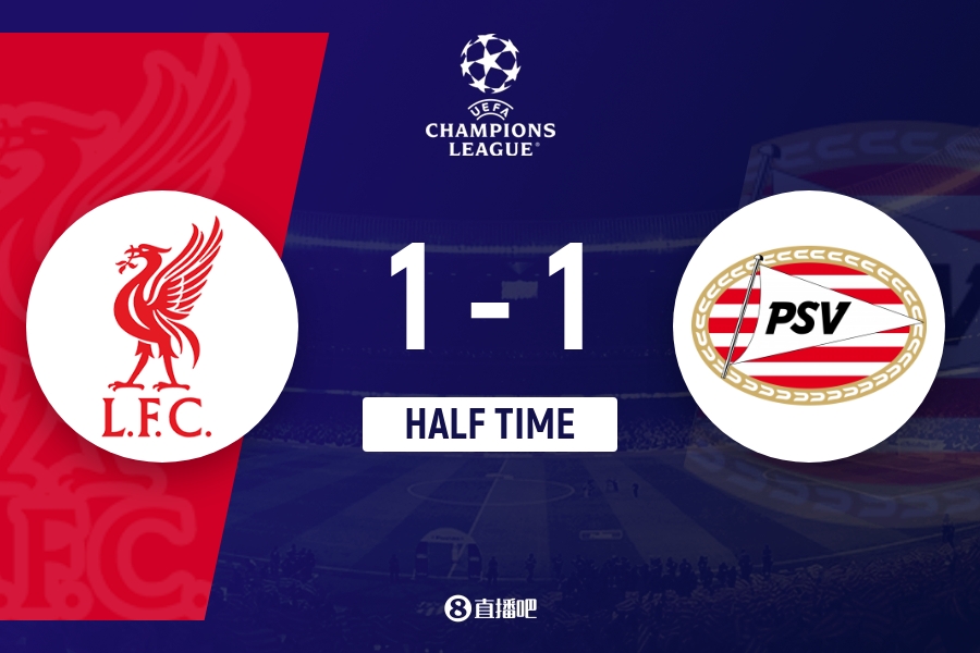 上半场伤停补时1分钟,半场甘休,利物浦暂1-1埃因霍温。