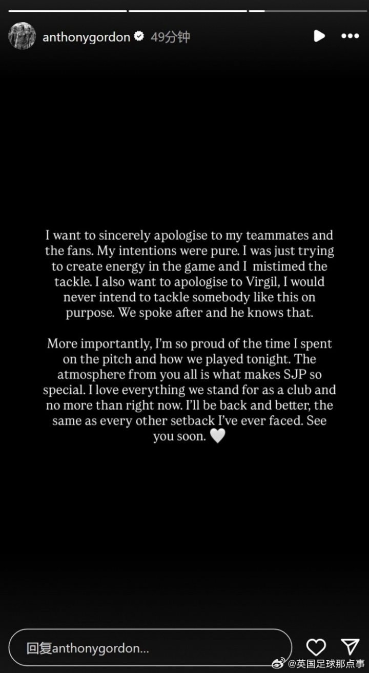 【不是挑升的】纽卡斯尔联2-3利物浦的比赛,戈登铲倒范戴克,染红离场。赛后戈登在社媒上谈歉: