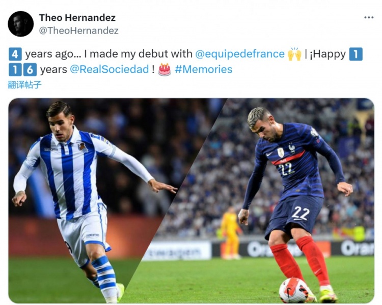 9月7日讯 特奥更新社媒动态,回顾法国队首秀4周年,并为皇家社会庆生。