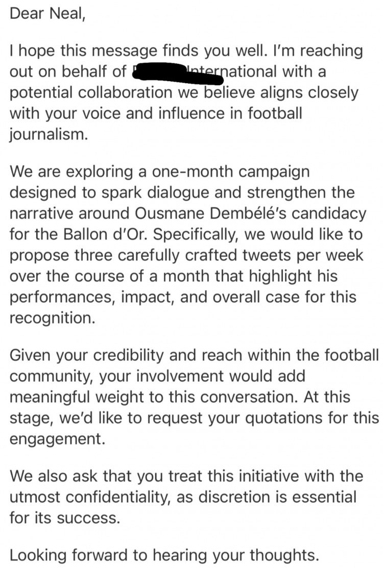 Neal社媒晒出公关公司的信函,并配文:“我最近被一家公关公司商酌,对方但愿我作念一个有偿宣传当作,为登贝莱竞争金球奖造势。我不知谈资方是谁,但我合计这件事太诞妄了,是以必须把它说出来让各人知谈。”