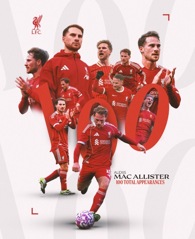 麦卡利斯特迎来利物浦生存百场里程碑之战,此前99场比赛,阿根廷东说念主打进14球并送出14次助攻。