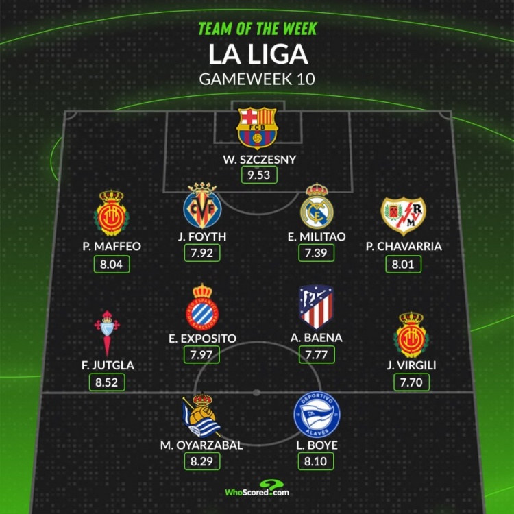 WhoScored西甲第10轮最好声势如下: