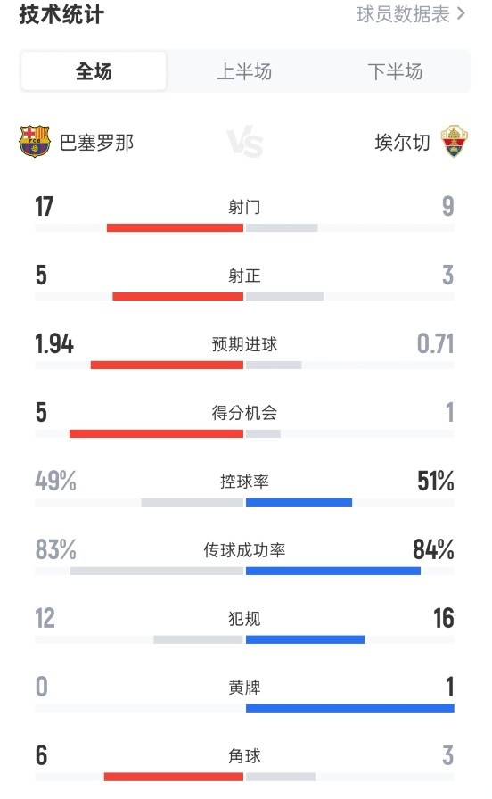 巴萨3-1埃尔切全场数据:射门17-9,射正5-3,控球率49%-51%