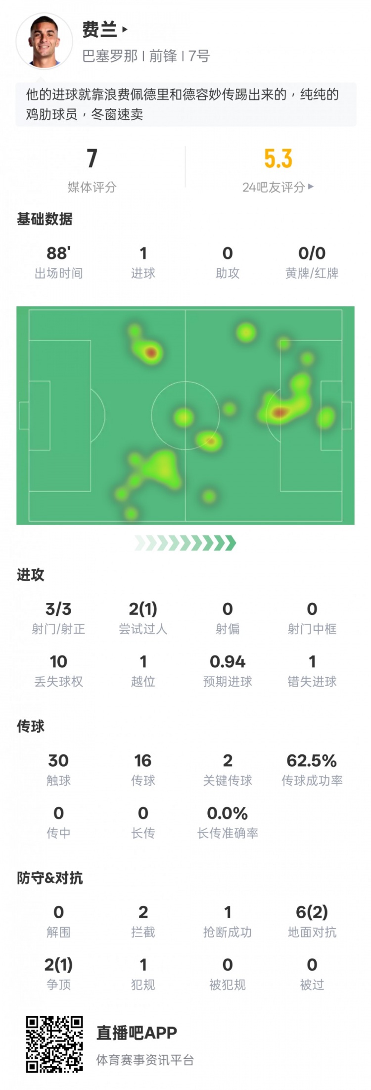 费兰本场比赛数据: