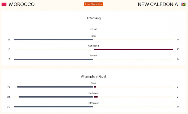本场比赛新喀里多尼亚早早被罚下两东谈主,第31分钟起就9东谈主作战。摩洛哥U17上半场打入7球,下半场再入9球,全场狂轰78脚射门,最终16-0赢下了这场比赛。