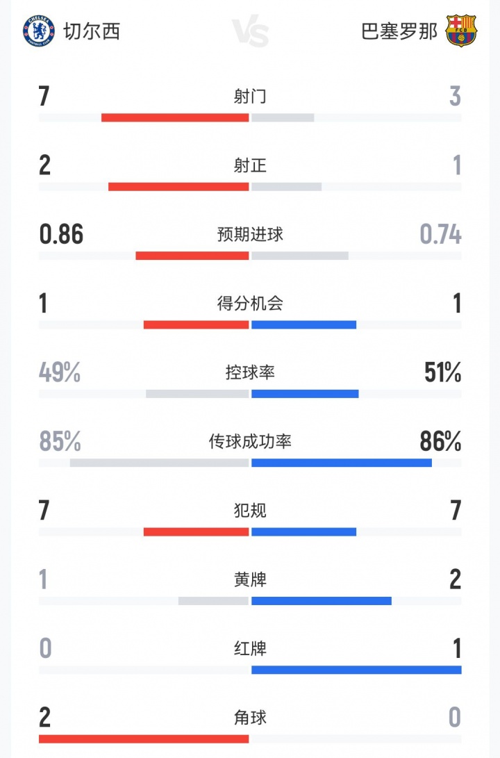 11月26日讯 欧冠联赛阶段第5轮,切尔西1-0巴萨 。半场数据如下↓
