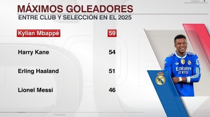 足坛2025年进球榜:姆巴佩59球居首,凯恩、哈兰德、梅西紧随自后