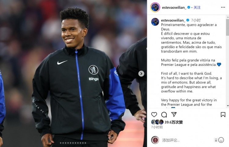 埃斯特旺此役为切尔西首发出战,送出助攻,并当选本场比赛最好球员。赛后他在酬酢媒体上写谈:“当先,我思感谢天主。 很难描述我现时的感受,各式热枕交汇在一齐。但最艰苦的是,我内心充满了感德和舒畅。