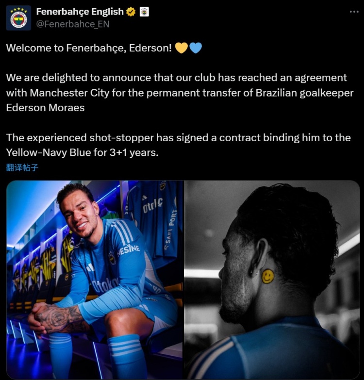 费内巴切官推示意:“宥恕来到费内巴切,埃德森!💛💙”