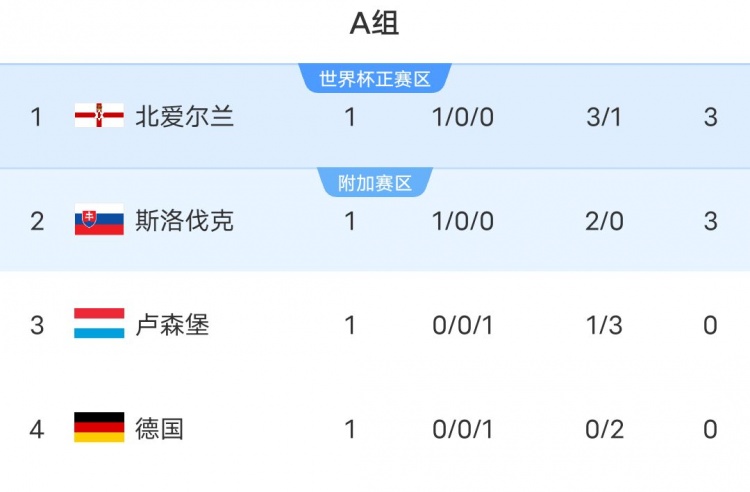 A组积分榜方面,德国现在1战1负净胜球-2&暂时垫底,北爱尔兰排行第一。