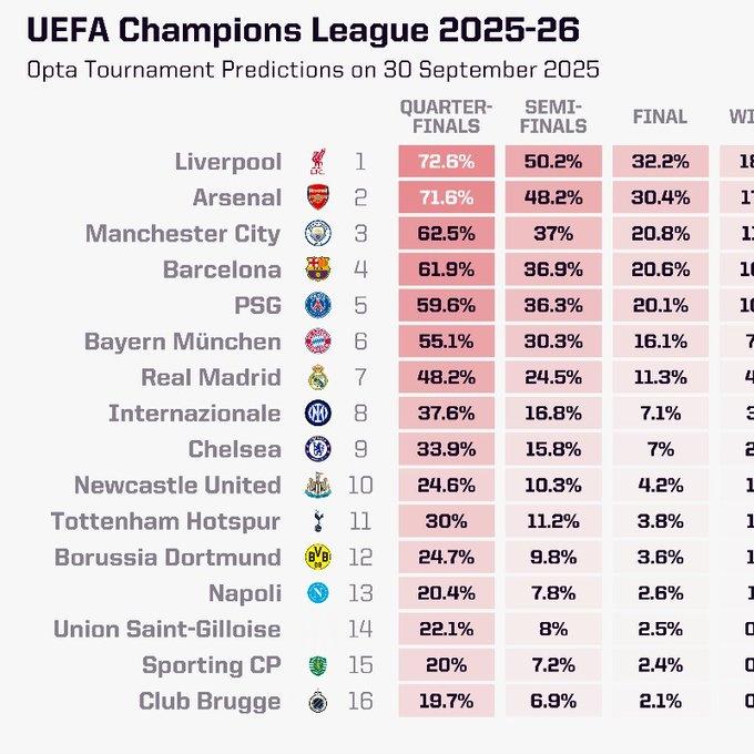 opta最新欧冠夺冠概率: 利物浦18%第一, 阿森纳17%第二, 皇马第七