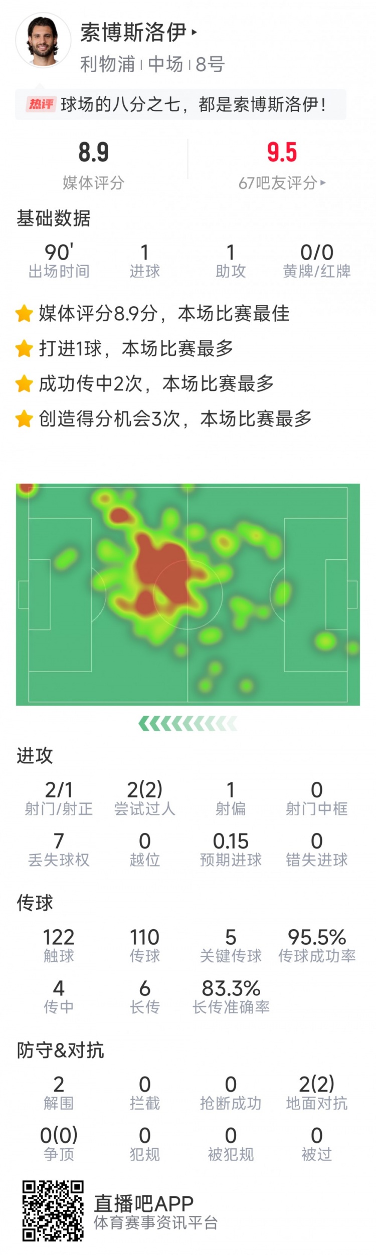 10月23日讯 欧冠第3轮,利物浦客场5-1大捷法兰克福,索博斯洛伊为球队踢满全场,并孝顺传射,当选队内本场最好球员。
