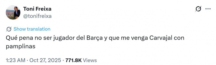 10月27日讯 当地本领10月26日,本赛季西甲第10轮国度德比,巴萨客场1-2负于皇马,前巴萨主席候选东谈主弗雷克萨(Toni Freixa)赛后更新社媒,月旦皇马球员卡瓦哈尔虚浮体育精神。