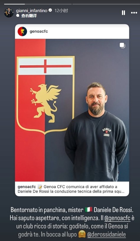 11月7日讯 德罗西昨日厚爱出任热那亚主帅,海外足联主席因凡蒂诺在我方的ins上向这位前罗马传闻奉上了道贺。