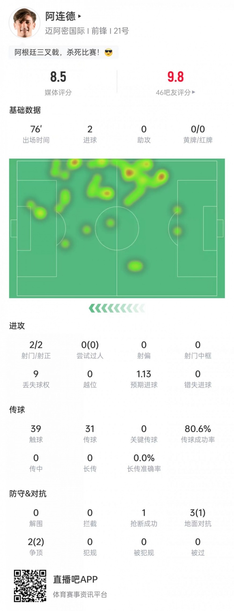 阿连德本场数据:2次射门打进2球,5次回击3次奏效,获评8.5分