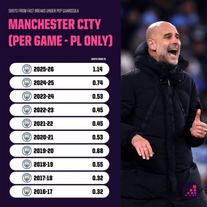 瓜迪奥拉抓教曼城英超场均快速反击射门次数:
