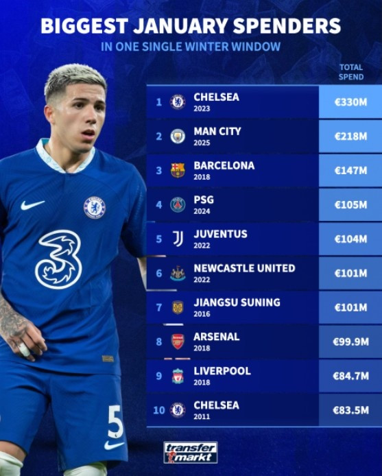 俱乐部单个冬窗引援破耗排名: 切尔西23年3.3亿欧居首, 苏宁上榜