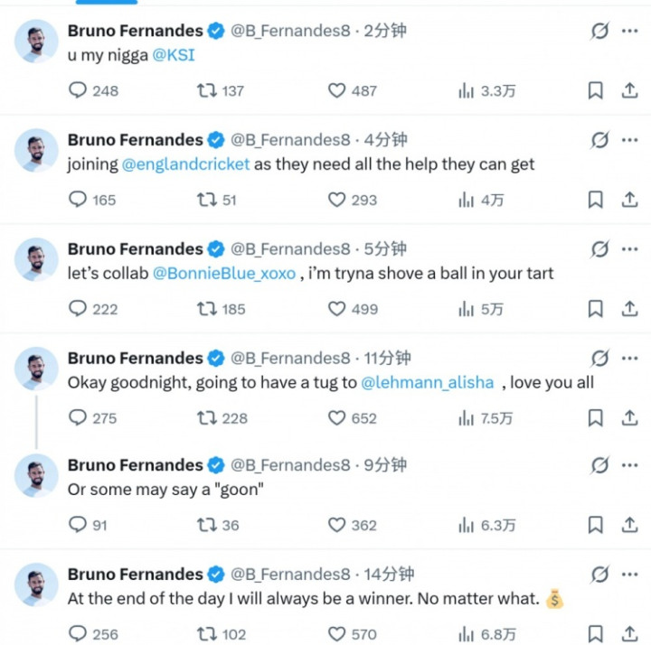 B费社媒已而发布多条信息,包括他要加盟第六级别俱乐部麦克尔斯菲尔德等实质,曼联官方阐明,B费的社媒账号被盗,敕令球迷不要参与该账号的任何互动。