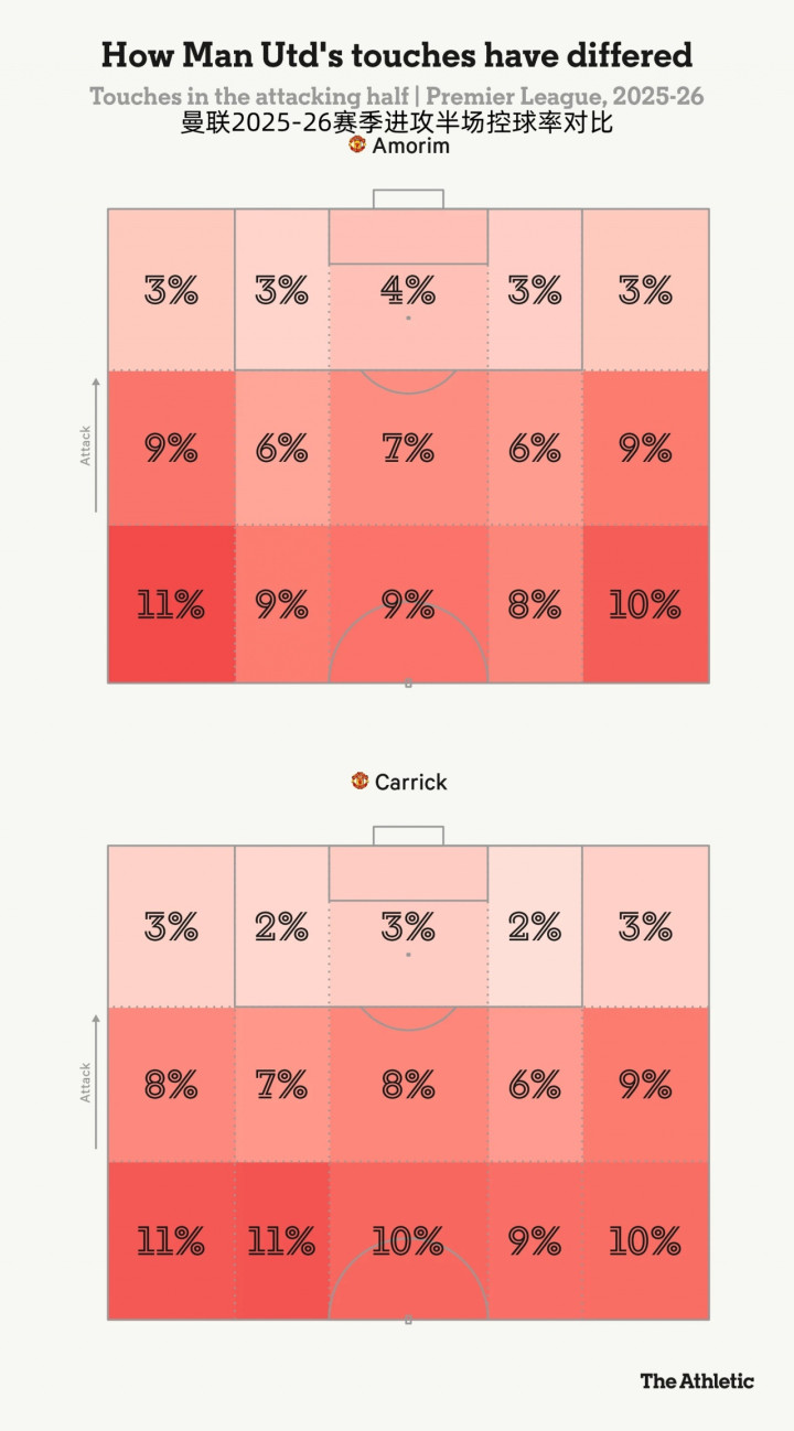 在卡里克手下,曼联盘带时间更长、更精细。曼联正在以更高的频率完成更多10次或以上的连续传送球 ,卡里克治下每场12.2次,高于阿莫林时期的9.7次。同时曼联的赛事 速度几乎与阿莫林时期相同,从每秒1.84米变为每秒1.83米,并且这些传送球 更多发生在对方半场。在攻击 三区,曼联从阿莫林时期每场完成77.2次传送球 ,提升到了卡里克治下的每场90.2次。