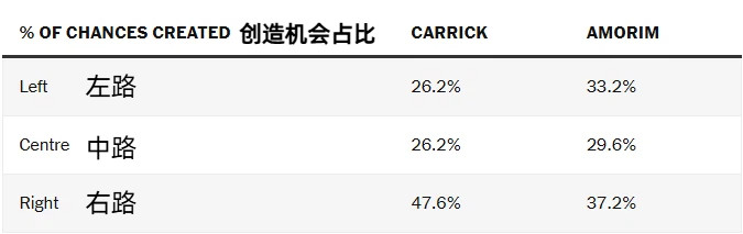 同时从右路创造的机会比例急剧上升,从阿莫林时期的大致均衡分布,变为卡里克治下偏向右侧的47.6%。