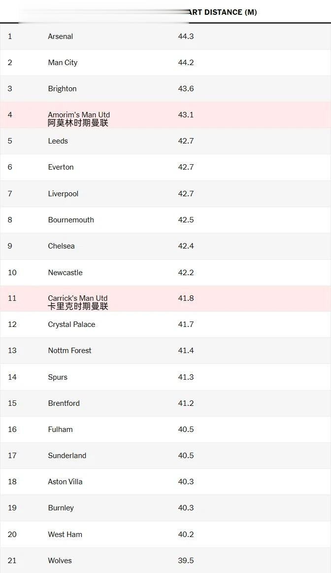 无球竞技状态 下,曼联发起逼抢时的平均起始距离从43.1米下降到41.8米。尽管起始位置更低、风险更小,但曼联对对手的逼抢程度几乎与以前一样。卡里克治下每场11.1次逼抢,仅略低于阿莫林时期的每场11.3次。