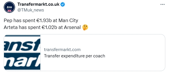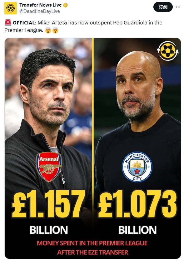这笔转会敲定后,有媒体称阿尔特塔在英超的破耗依然达到11.57亿镑,超越了瓜迪奥拉(10.73亿镑),但这个报说念遭到德转打脸。