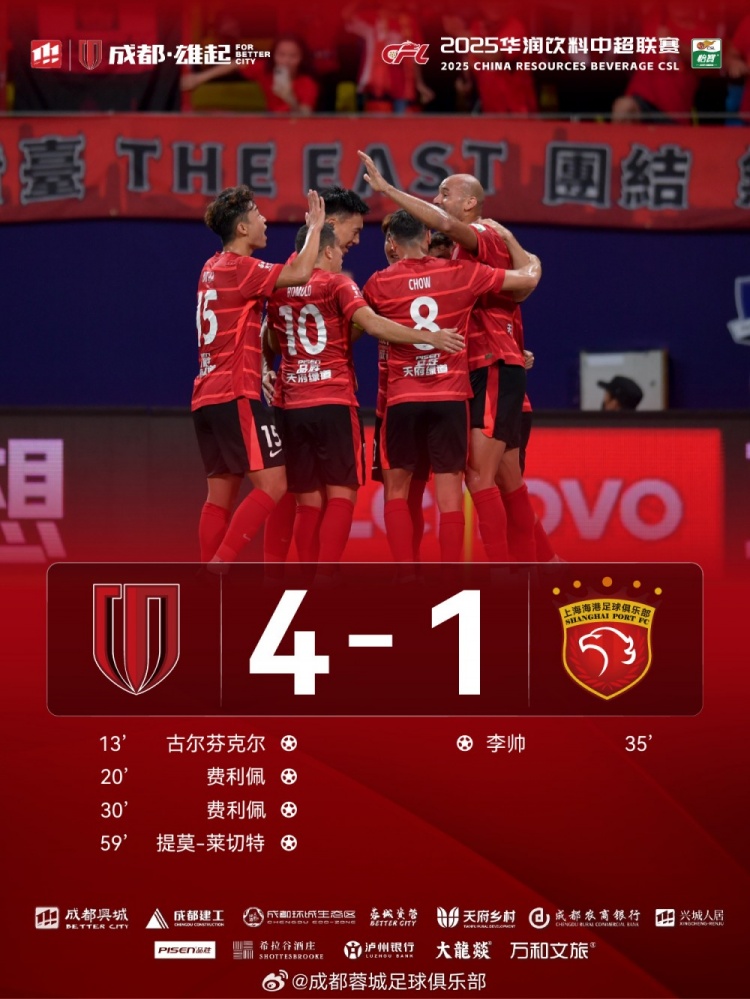 大胜!费利佩双响、韦世豪献助攻,成齐蓉城4-1慑服上海海港