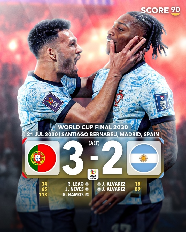 葡萄牙加时3-2逆转绝杀阿根廷,阿尔瓦雷斯首开记载,莱奥、若奥-内维斯进球反超,小蜘蛛双响扳平拖入加时,贡萨洛-拉莫斯加时绝杀。
