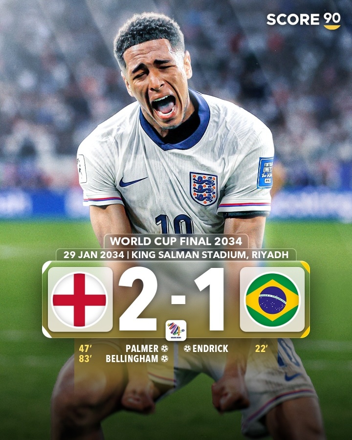 英格兰2-1逆转巴西,恩德里克领先破门,帕尔默扳平比分,贝林厄姆破门完成逆转。