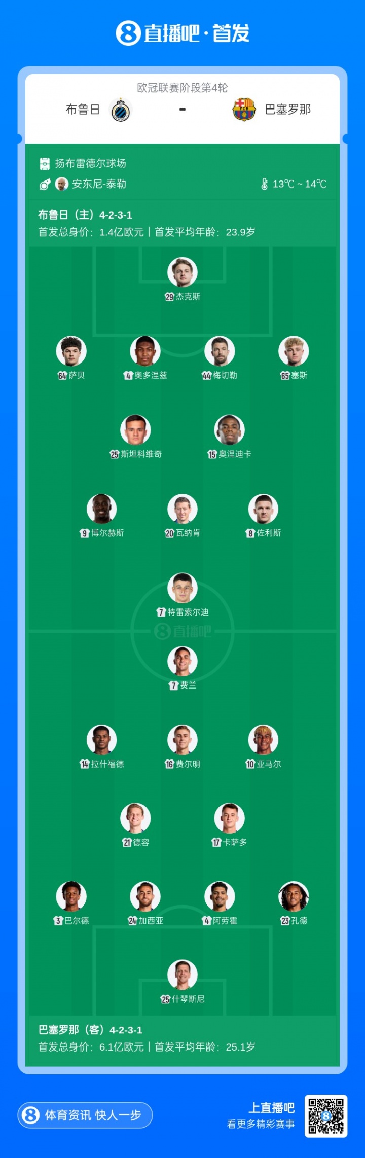 11月6日讯 北京技巧11月6日4:00,欧冠第4轮,布鲁日vs巴萨。赛前两边公布了首发名单。【巴萨方面,延续了拉什福德-费兰-亚马尔三叉戟,中场位置卡萨多搭档德容构成后腰组合,此前伤愈的莱万、奥尔莫本场不时替补待命。】