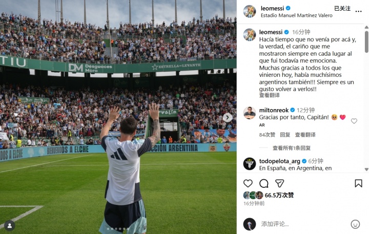 11月13日讯 梅西发布社媒,感谢了今天在埃尔切不雅看我方历练的球迷们。