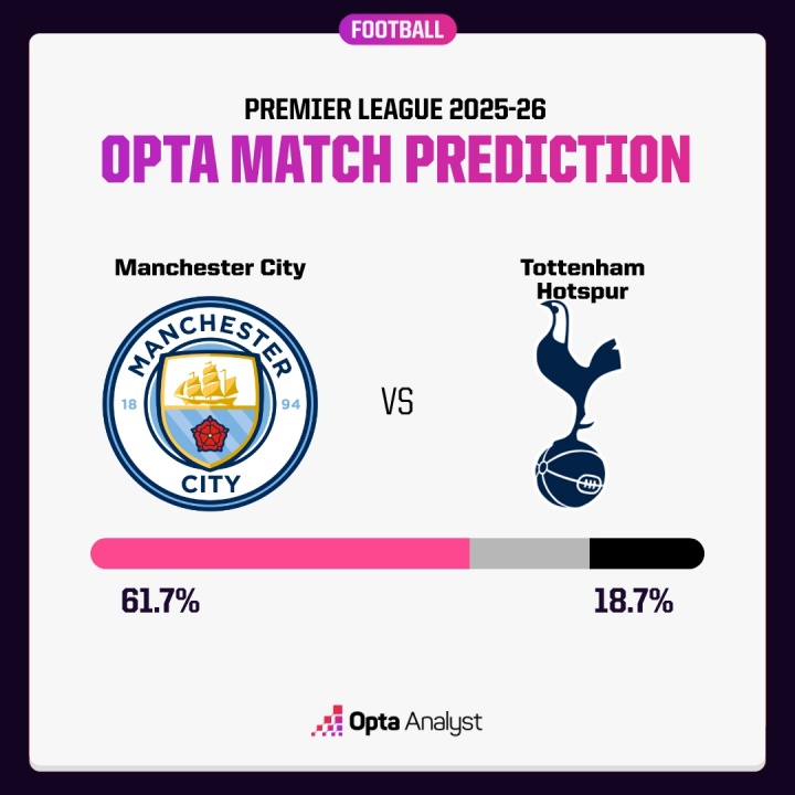 08月23日讯 今晚19:30,英超第2轮焦点战曼城vs热刺。曼城首轮4-0投诚狼队,而热刺3-0投诚伯恩利,此役瓜迪奥拉阐述罗德里、福登不错出战,本轮谁能争得两连胜?Opta超等狡计机有计划,曼城的胜率为61.7%。