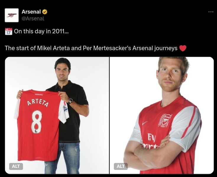 阿森纳官推晒照:2011年的今天,阿尔特塔&默特萨克开启枪手生活